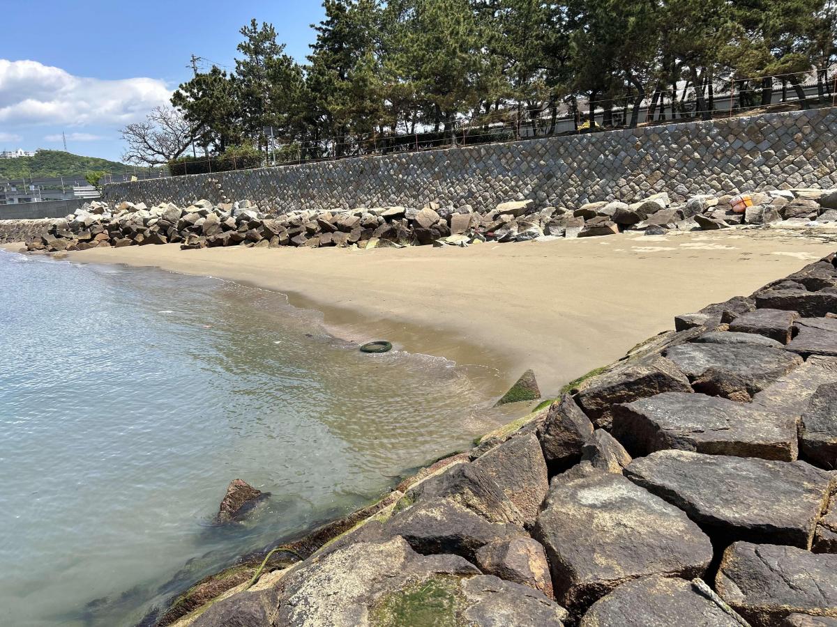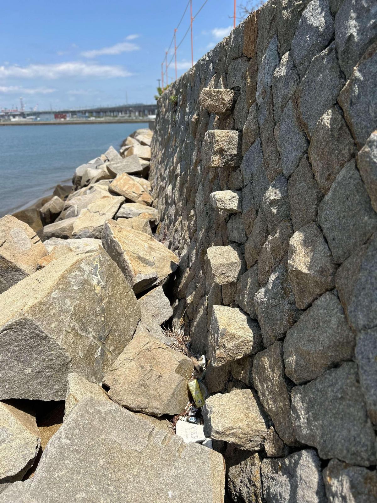 うたづ臨海公園の最端に、海水に隠れた歴史跡があります。 干潮時のみ姿を現す石積みの波止で、塩田最盛期時代の運搬船の為などに設けられたものだそうで、いまだに形を残している貴重なスポットです。